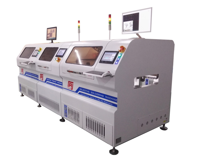 ●选择性锡炉部分–一套独立的锡泵装置,波峰高度,波峰校正等均可独立设定,外置式双发热板,热传递更加完美。锡炉均采用快速接头连线,进行锡炉更换时无需重新接线。波峰均采用闭环伺服控制,可设定定期进行波峰高度的自我校正。焊接过程的实时显示,通过摄像头与显示器,把焊接过程实时显示出来。锡炉配锡液位报警。